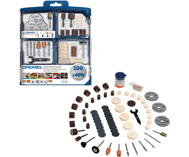 ● 100 parçadan oluşan Dremel çok amaçlı aksesuar seti hızlı ve kolay bir aksesuar değişimi sağlayan EZ SpeedClic aksesuarları da dahil olmak üzere 100 adet yüksek kaliteli orijinal Dremel aksesuar içermektedir. Bu aksesuar seti ile birçok farklı malzemeler içeren birbirinden farklı uygulamaların üstesinden gelebilirsiniz. Saklama çantası sayesinde Dremel aksesuarlarınızı kolaylıkla muhafaza edebilirsiniz. |